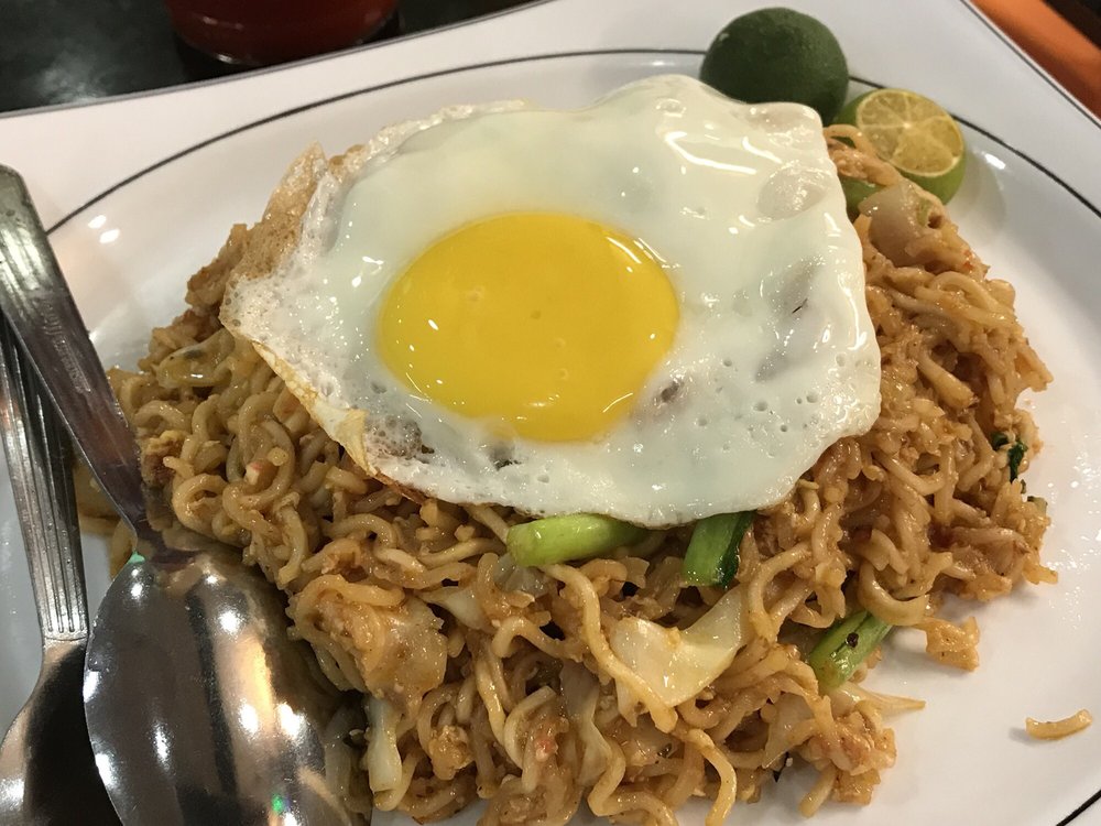 Mamak style fried noodles with eggs, minced chicken, bean curd and vegetables